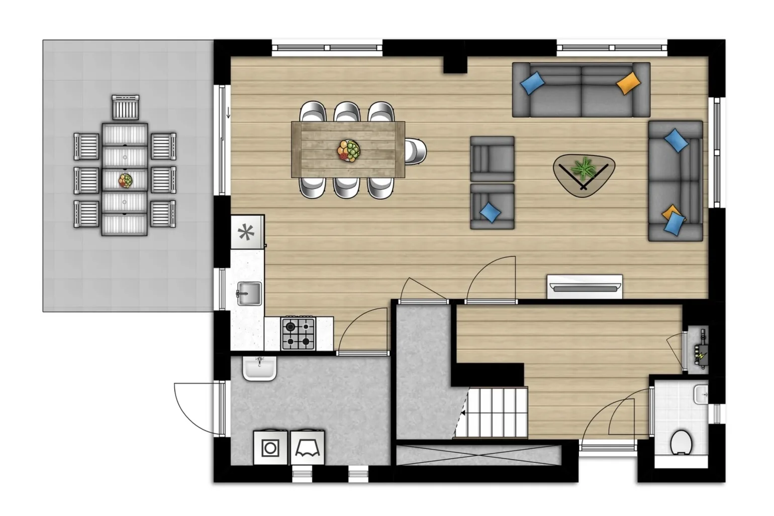 Deze vrijstaande vakantiewoning (woningtype BBL7 Comfort) is geschikt voor 7 personen en is volledig voorzien van vloerverwarming. Via de hal met apart toilet kom je in de lichte, ruime woonkamer. De tv heeft streamingfuncties, zodat je eenvoudig vanaf je telefoon of tablet kunt streamen met je eigen apps en accounts.