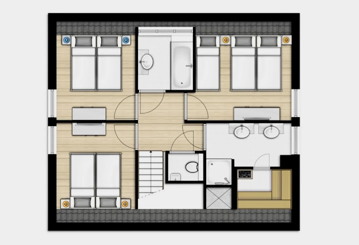 Op de eerste verdieping vind je 3 slaapkamers. Eén slaapkamer is ingericht met een tweepersoonsbed met comfortabele matras-topper en een tv. De andere twee slaapkamers hebben 2 of 3 eenpersoonsbedden, waarvan één slaapkamer ook een tv heeft.